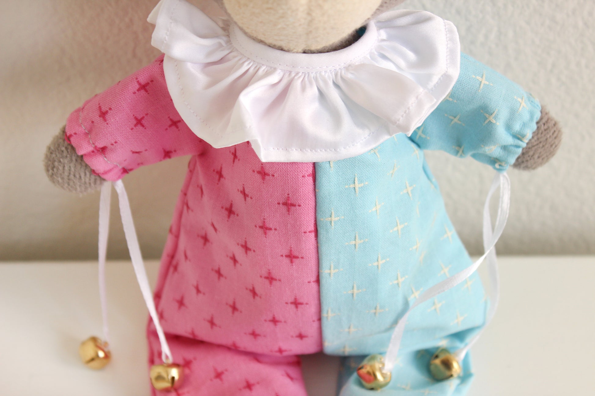 This coverall is made of a machine embroidered cotton fabric in two colors, with a silky white and bias collar. The sleeves are drawstring style with bells attached to the ribbon pulls, and the legs have a ruffle elastic cuff. It closes with metal snaps on the back and has a slot for tails. This suit is full of joy and whimsy, with working jingling bells and exaggerated proportions.